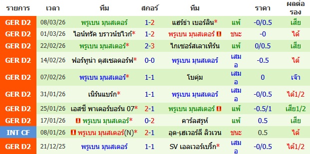 ผลงาน 10 นัดหลังสุดของทีม พรูเบน มุนสเตอร์